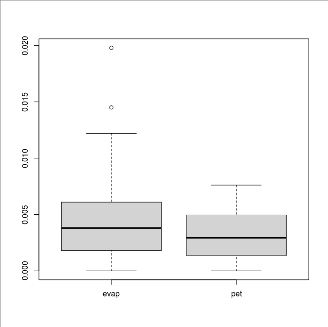 boxplot(data.frame(evap, pet))