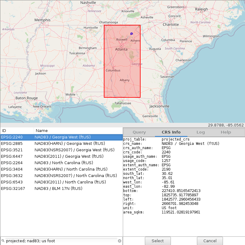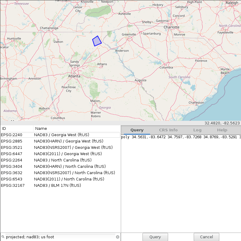 Zoom to the area of the watershed using Ctrl + dragging and draw a bounding polygon using left-clicks (double left-click to complete drawing). Refer to the Help tab. Click Query and search for “projected; nad83; us foot”.